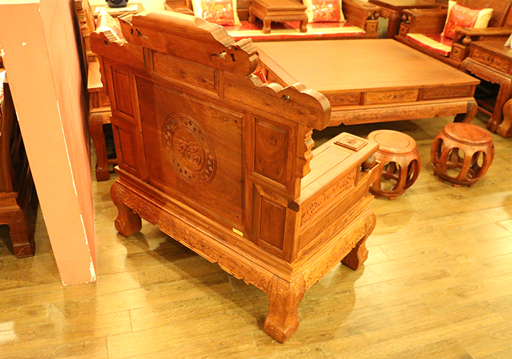 之后,我們再來看看沙發的細節:雕刻紋樣。單人沙發背板后刻有一大圓形“福”字樣的圖案,有福祿雙全、福星高照之意;在沙發正上方刻有一帶“發”字的花紋,寓有大吉大利、財源亨特之意;沙發正背板處刻有樹杈、枝葉以及小鳥,頗顯生氣與活力,帶有春意濃濃、朝氣蓬勃之寓意;沙發靠手兩側帶有一可以轉動的滾珠,在其下方則有一可以推入拉出的小屜,多以裝飾之用。我們再來看看與之沙發配套的高幾,高幾上方抽屜拉環處刻有一十分立體飽滿之元寶圖案,彰顯著財運滾滾系列沙發的初始寓意,其下方鑲嵌刻有一古時候人們常佩戴之金鎖圖案花紋,并串有幾圈環形銅錢,而兩側則分別帶有兩只金雞圖案的刻紋遙頭相對,昭示著金雞破曉,財源廣進之意,十分形象生動。在其幾腿上則配以祥云花紋環繞相倚,給人一渾渾一體、流暢行云之感。其他兩只,雙人長沙發以及臺幾其中花紋也多以其類似相間,鑒于筆者文字水平以及無實物接觸的原因,有些細節之處可能并未在此提及,不過這一系列之沙發總體以賦含了“財源滾滾”“財運亨特”“大吉大利”之意,配之以古樸的木雕工藝以及中國文化之豐富內涵與底蘊,給人以一股極為濃郁的東方家具之氣息,美麗沉淀。