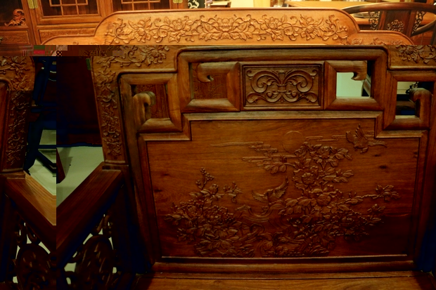 靠背板處最下方的位置,同樣是和最上端木板一樣,木板的形狀呈“凸”字形式樣設計,左右較之寬長,上方“幾”字形部分則較為扁實。其板面的正反兩邊均繪有一幅景致優美,生氣秀麗的花鳥云彩圖,可以看見:那兩只飛舞躍動的小鳥正在花團錦簇的牡丹群里嬉戲玩耍,一只正準備躍起高飛振翅翱翔飛離花海,而另外一只則靜靜恰好簇立停留在了枝頭,打算收回雙翅凝首回望,濃情注視著對方,深情而依偎…花海的上方還雕繪有一輪明媚的驕陽,倚靠著云彩,浮影略現,雋秀唯美。整體畫案給人一種花香鳥語的意境美,而那醉人驚艷的牡丹海,正映示了該系列沙發“國色天香”的這一主題,牡丹高貴典雅的氣質以及姹紫嫣紅的花色,也蘊帶了雍容大度,吉祥富貴,典雅祥和之寓意,它是美的化身,也有純潔與愛情的象征意義。