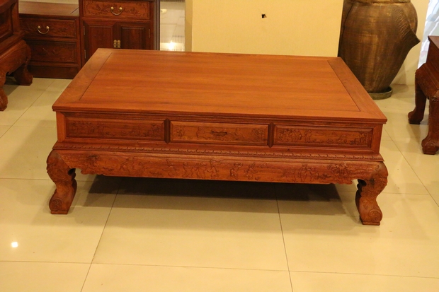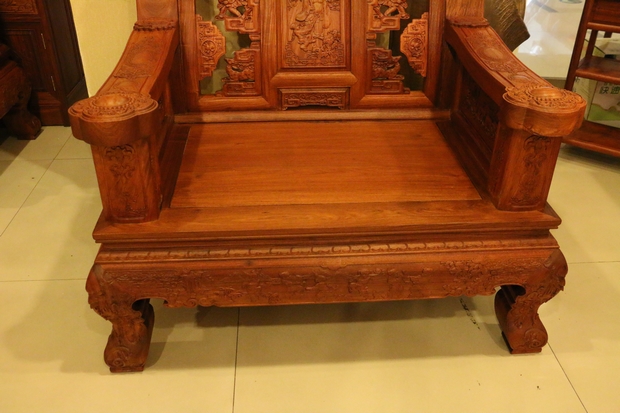 然后是沙發(fā)的座面,溫潤細實,經(jīng)燙蠟工藝處理后的緬花木面更帶有一種淡淡地透亮光澤,古香古韻。再在下方位置,束腰及牙條部分同樣還有幾些人物、花草、幾何紋飾以及祥云之浮雕雕刻,給人以一種如履仙境之感,藝術畫面感極為強烈!